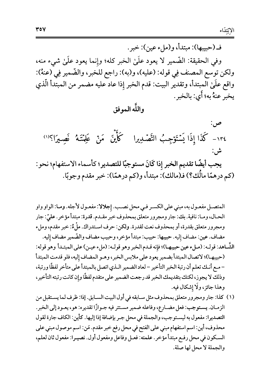 (¬١) كذا: جار ومجرور متعلق بمحذوف مثل سابقه في أول البيت السابق. إذا: ظرف لما يستقبل من الزمان. يستوجب: فعل مضارع، وفاعله ضمير مستتر فيه جوازًا تقديره: هو، يعود إلى الخبر. التصديرا: مفعول به ليستوجب، والجملة في محل جر بإضافة إذا إليها. كأين: الكاف جارة لقول محذوف، أين: اسم استفهام مبني على الفتح في محل رفع خبر مقدم. مَن: اسم موصول مبني على السكون في محل رفع مبتدأ مؤخر. علمته: فعل وفاعل ومفعول أول. نصيرا: مفعول ثان لعلم، والجملة لا محل لها صلة.