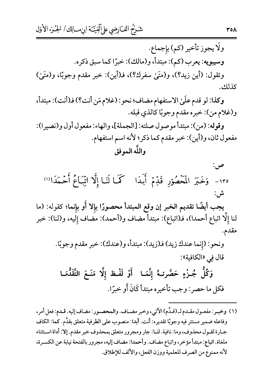 (¬١) وخبر: مفعول مقدم لـ (قدِّم) الآتي، وخبر مضاف. والمحصور: مضاف إليه. قدم: فعل أمر، وفاعله ضمير مستتر فيه وجوبًا تقديره: أنت. أبدا: منصوب على الظرفية متعلق بقدِّم. كما: الكاف جارة لقول محذوف، وما: نافية. لنا: جار ومجرور متعلق بمحذوف خبر مقدم. إلا: أداة استثناء ملغاة. اتباع: مبتدأ مؤخر، واتباع مضاف. وأحمدا: مضاف إليه، مجرور بالفتحة نيابة عن الكسرة، لأنه ممنوع من الصرف للعلمية ووزن الفعل، والألف للإطلاق.