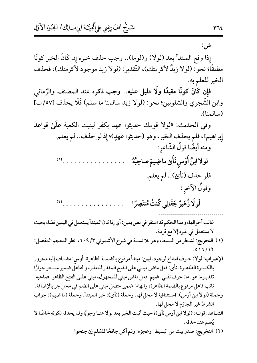 الشاهد: قوله: (لولا ابن أوس نأى)؛ حيث أثبت الخبر بعد لولا هنا وجوبًا ولم يحذفه لكونه خاصًا لا يُعلم عند حذفه.