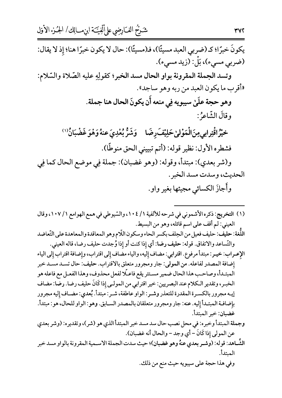 الشاهد: قوله: (وشر بعدي عنهُ وهو غضبان)؛ حيث سدت الجملة الاسمية المقرونة بالواو مسد خبر المبتدأ.