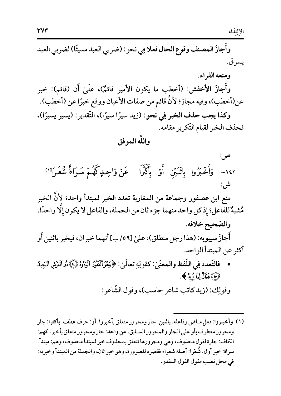 ١٤٢ - وَأَخبَرُوا بِاثنَين أَوْ بِأَكْثَرا ... عَن وَاحِدٍ كَهُمْ سَرَاةٌ شُعَرَا (¬١)