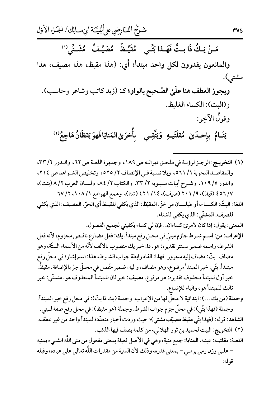 الإعراب: من: اسم شرط جازم مبنيّ في محل رفع مبتدأ. يك: فعل مضارع ناقص مجزوم، لأنه فعل الشرط، واسمه ضمير مستتر تقديره: هو. ذا: خبر يك منصوب بالألف لأنّه من الأسماء الستّة، وهو مضاف. بتّ: مضاف إليه مجرور. فهذا: الفاء رابطة جواب الشرط، هذا: اسم إشارة في محلّ رفع مبتدأ. بتّي: خبر المبتدأ مرفوع، وهو مضاف، والياء ضمير متّصل في محلّ جرّ بالإضافة. مقيظٌ: خبر أول لمبتدأ محذوف تقديره: هو مرفوع. مصيف: خبر ثان للمبتدأ المحذوف هو. مشتّى: خبر ثالث للمبتدأ هو، والياء للإشباع.
