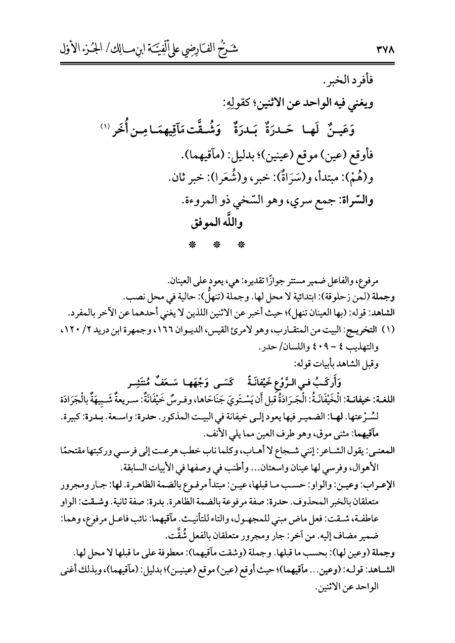 الإعراب: وعين: والواو: حسب ما قبلها، عين: مبتدأ مرفوع بالضمة الظاهرة. لها: جار ومجرور متعلقان بالخبر المحذوف. حدرة: صفة مرفوعة بالضمة الظاهرة. بدرة: صفة ثانية. وشقت: الواو عاطفة، شقت: فعل ماض مبني للمجهول، والتاء للتأنيث. مآقيهما: نائب فاعل مرفوع، وهما: ضمير مضاف إليه. من آخر: جار ومجرور متعلقان بالفعل شُقَّت.