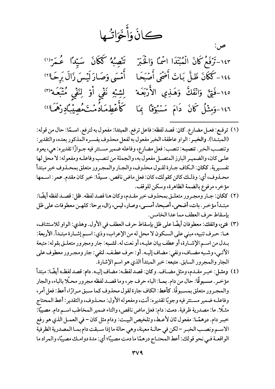 (¬٢) ككان: جار ومجرور متعلق بمحذوف خبر مقدم، وكان هنا قصد لفظه. ظل: قصد لفظه أيضًا: مبتدأ مؤخر. بات، أضحى، أصبحا، أمسى، وصار، ليس؛ زال؛ برحا: كلهن معطوفات على ظل بإسقاط حرف العطف مما عدا الخامس.
