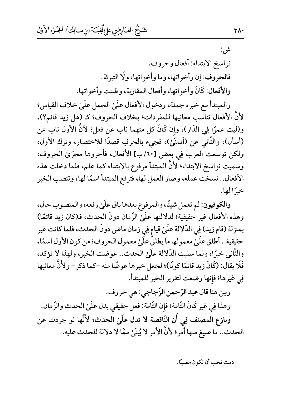 والمبتدأ مع خبره جملة، ودخول الأفعال علَى الجمل علَى خلاف القياس؛ لأنَّ الأفعال تناسب معانيها للمفردات، بخلاف الحروف، كـ (هل زيد قائم؟)، و (ليت عمرًا فِي الدّار)، وإِن كَانَ كل منهما ناب عن فعل، لأنَّ الأول ناب عن (أسأل)، والثّاني عن (أتمنَى)، فجيء بالحرفِ قصدًا للاختصار، وترك الأول، ولكن توسعت العرب فِي بعض الأفعال، فأجروها مجرَى الحروف، وسميت نواسخ الابتداء؛ لأنَّ المبتدأ مرفوع بالابتداء كما علم، فلما دخلت هذه الأفعال .. نسخت عمله، وصار العمل لها، فترفع المبتدأ اسمًا لها، وتنصب الخبر خبرًا لها.