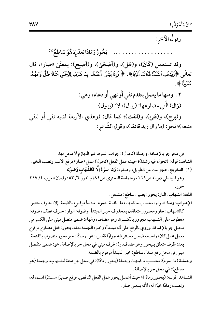 الشاهد: قوله: (يحور رمادًا)؛ حيث أعمل يحور عمل الفعل الناقص، فرفع ضميرًا مستترًا اسما له، ونصب رمادًا خبرًا له، لأنه بمعنى صار.