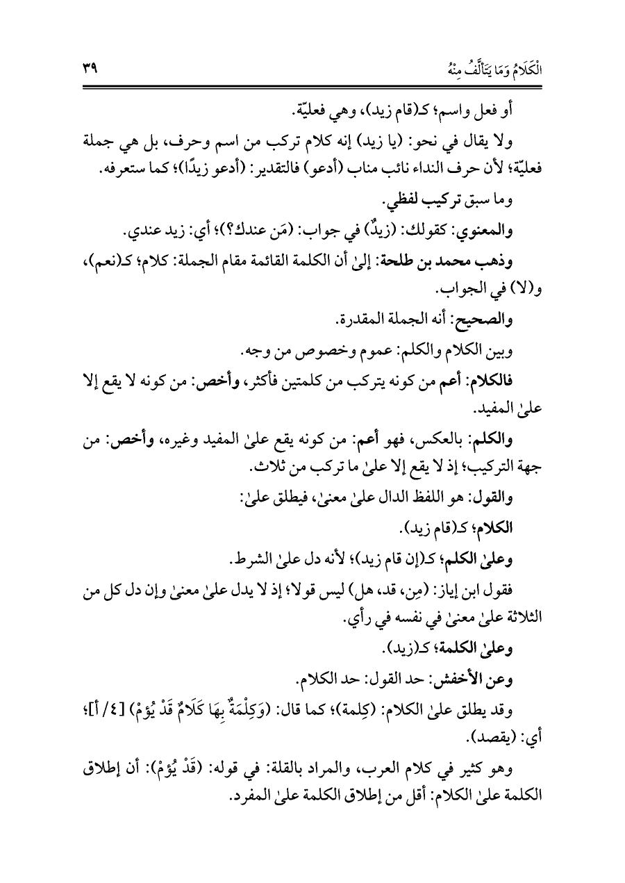 وقد يطلق على الكلام: (كِلمة)؛ كما قال: (وَكِلْمَةٌ بِهَا كَلَامٌ قَدْ يُؤمْ)؛ أي: (يقصد).