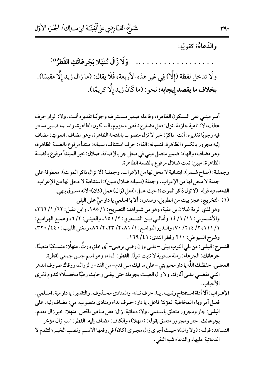 الإعراب: ألا أداة استفتاح وتنبيه. يا: حرف نداء والمنادى محذوف. والتقدير: يا دار مية. اسلمي: فعل أمر وياء المخاطبة المؤنثة فاعل. يا دار: حرف نداء ومنادى منصوب. مي: مضاف إليه. على البلى: جار ومجرور متعلق باسلمي. ولا: دعائية. زال: فعل ماض ناقص. منهلا: خبر زال مقدم. بجرعائك: جار ومجرور متعلق بقوله: (منهلا)، والكاف: مضاف إليه. القطر: اسم زال مؤخر.