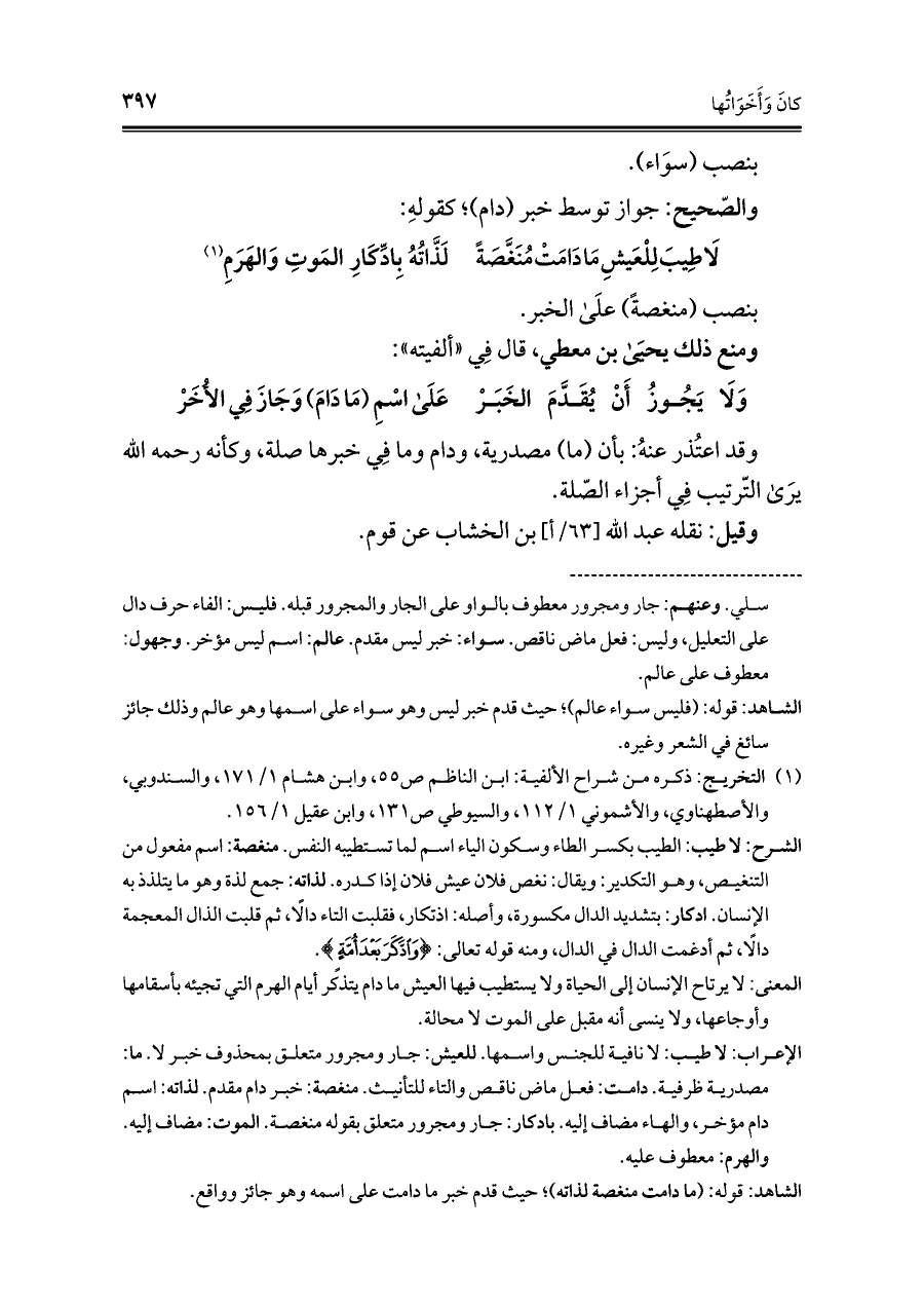 الشاهد: قوله: (ما دامت منغصة لذاته)؛ حيث قدم خبر ما دامت على اسمه وهو جائز وواقع.