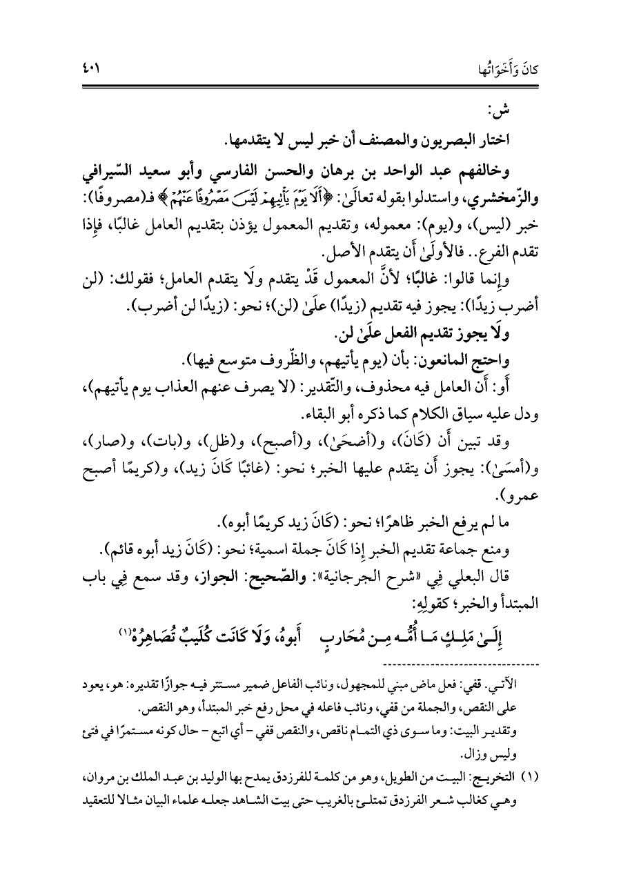 وخالفهم عبد الواحد بن برهان والحسن الفارسي وأبو سعيد السّيرافي والزّمخشري، واستدلوا بقوله تعالَى: {أَلَا يَوْمَ يَأْتِيهِمْ لَيْسَ مَصْرُوفًا عَنْهُمْ} فـ (مصروفًا): خبر (ليس)، و (يوم): معموله، وتقديم المعمول يؤذن بتقديم العامل غالبًا، فإِذا تقدم الفرع .. فالأولَى أَن يتقدم الأصل.