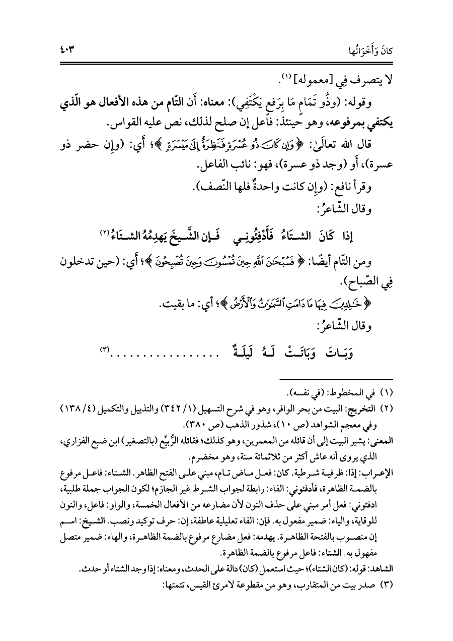 وقوله: (وذُو تَمَامٍ مَا برفعٍ يَكْتَفِي): معناه: أَن التّام من هذه الأفعال هو الّذي يكتفي بمرفوعه، وهو حينئذ: فاعل إن صلح لذلك، نص عليه القواس.
