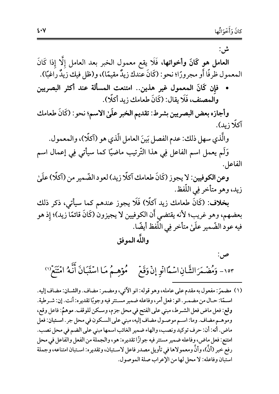 بخلاف: (كَانَ طعامك زيد آكلًا) فَلَا يجوز عندهم كما سيأتي، ذكر ذلك بعضهم، وهو غريب؛ لأنه يقتضي أَن الكوفيين لا يجيزون (كَانَ قائمًا زيد)؛ إِذ هو فيه عود الضّمير علَى متأخر فِي اللّفظ أيضًا.