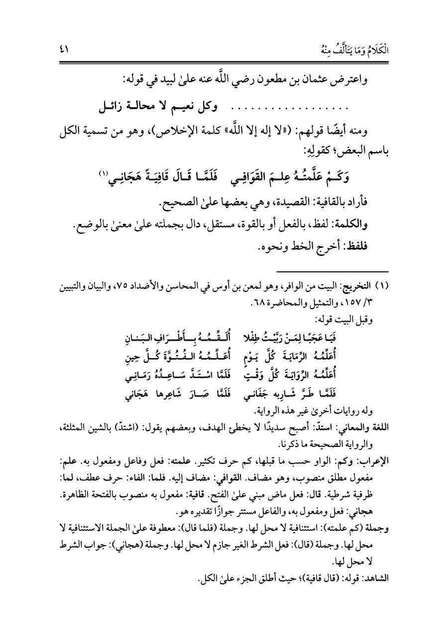 اللغة والمعاني: استدّ: أصبح سديدًا لا يخطئ الهدف، وبعضهم يقول: (اشتدّ) بالشين المثلثة، والرواية الصحيحة ما ذكرنا. الإعراب: وكم: الواو حسب ما قبلها، كم حرف تكثير. عليته: فعل وفاعل ومفعول به. علم: مفعول مطلق منصوب، وهو مضاف. القوافي: مضاف إليه. فلما: الفاء: حرف عطف، لما: ظرفية شرطية. قال: فعل ماض مبني على الفتح. قافية: مفعول به منصوب بالفتحة الظاهرة.