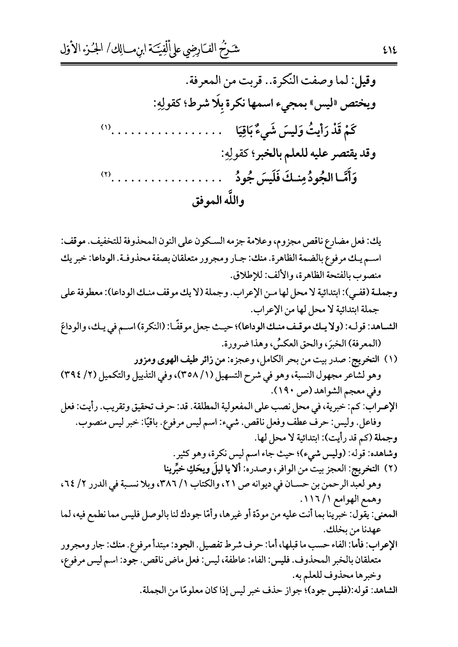 الشاهد: قوله: (ولا يك موقف منك الوداعا)؛ حيث جعل موقفًا: (النكرة) اسم في يك، والوداعَ (المعرفة) الخبرَ، والحق العكسُ، وهذا ضرورة.