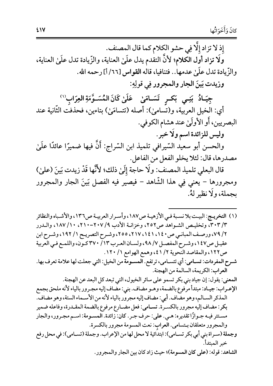 الإعراب: جياد: مبتدأ مرفوع بالضمة، وهو مضاف. بني: مضاف إليه مجرور بالياء لأنه ملحق بجمع المذكر السالم، وهو مضاف. أبي: مضاف إليه مجرور بالياء لأنه من الأسماء الستة، وهو مضاف. بكر: مضاف إليه مجرور بالكسرة. تسامى: فعل مضارع مرفوع بالضمة المقدرة، وفاعله ضمير مستتر فيه جوازًا تقديره: هي. على: حرف جر. كان: زائدة. المسومة: اسم مجرور، والجار والمجرور متعلقان بتسامى. العراب: نعت المسومة مجرور بالكسرة.