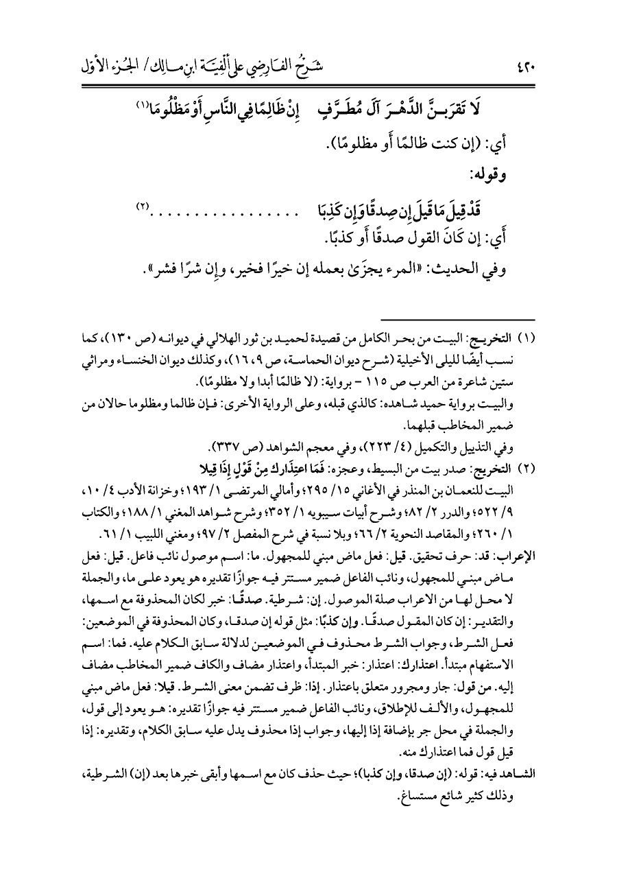 (¬١) التخريج: البيت من بحر الكامل من قصيدة لحميد بن ثور الهلالي في ديوانه (ص ١٣٠)، كما نسب أيضًا لليلى الأخيلية (شرح ديوان الحماسة، ص ٩، ١٦)، وكذلك ديوان الخنساء ومراثي ستين شاعرة من العرب ص ١١٥ - برواية: (لا ظالمًا أبدا ولا مظلومًا).