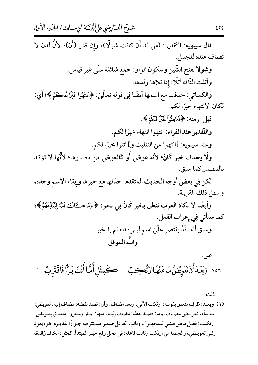 ١٥٦ - وَبَعْدَ أَنْ تَعْوِيْضُ مَا عَنْها ارْتُكِبْ ... كَمِثْلِ أَمَّا أَنْتَ بَرًّا فَاقتَرِب (¬١)