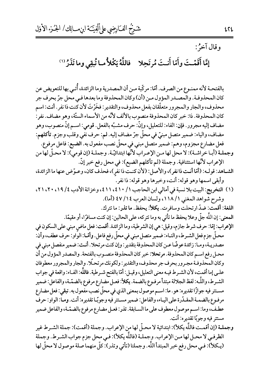 الإعراب: إمّا: حرف شرط جازم، وقيل: هي إن الشرطية، وما الزائدة. أقمت: فعل ماضٍ مبني على السكون في محلّ جزم فعل الشرط، والتاء: ضمير متصل مبني في محلّ رفع فاعل. وأقات الواو: حرف عطف، وأن: مصدرية، وما: زائدة عوضًا عن كان المحذوفة بتقدير: وإن كنت مرتحلًا. أنت: ضمير منفصل مبني في محل رفع اسم كان المحذوفة. مرتحلا: خبر كان المحذوفة منصوب بالفتحة. والمصدر المؤول من أن وكان المحذوفة مجرور بحرف جر محذوف، والتقدير: ولكونك مرتحلًا. والجار والمجرور معطوفان على إما أقمت، لأن الشرط فيه معنى التعليل، وقيل: أمّا بالفتح شرطية. فالله: الفاء: واقعة في جواب الشرط، والله: لفظ الجلالة مبتدأ مرفوع بالضمة. يكلأ: فعل مضارع مرفوع بالضمّة، والفاعل: ضمير مستتر فيه جوازًا تقديره: هو. ما: اسم موصول بمعنى الذي في محلّ نصب مفعول به. تبقي: فعل مضارع مرفوع بالضمة المقدّرة على الياء، والفاعل: ضمير مستتر فيه وجوبًا تقديره: أنت. وما: الواو: حرف عطف، وما: اسم موصول معطوف على ما السابقة. تذر: فعل مضارع مرفوع بالضمّة، والفاعل ضمير مستتر فيه وجوبًا تقديره: أنت.