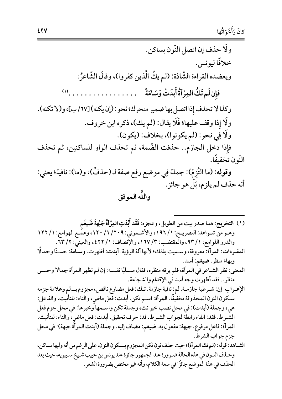 الشاهد: قوله: (لم تك المرآة)؛ حيث حذف نون تكن المجزوم بسكون النون، على الرغم من أنه وليها ساكن، وحذف النون في هذه الحالة ضرورة عند الجمهور جائزة عند يونس بن حبيب شيخ سيبويه، حيث يعد الحذف في هذا الموضع جائزًا في سعة الكلام، وأنه غير مختص بضرورة الشعر.