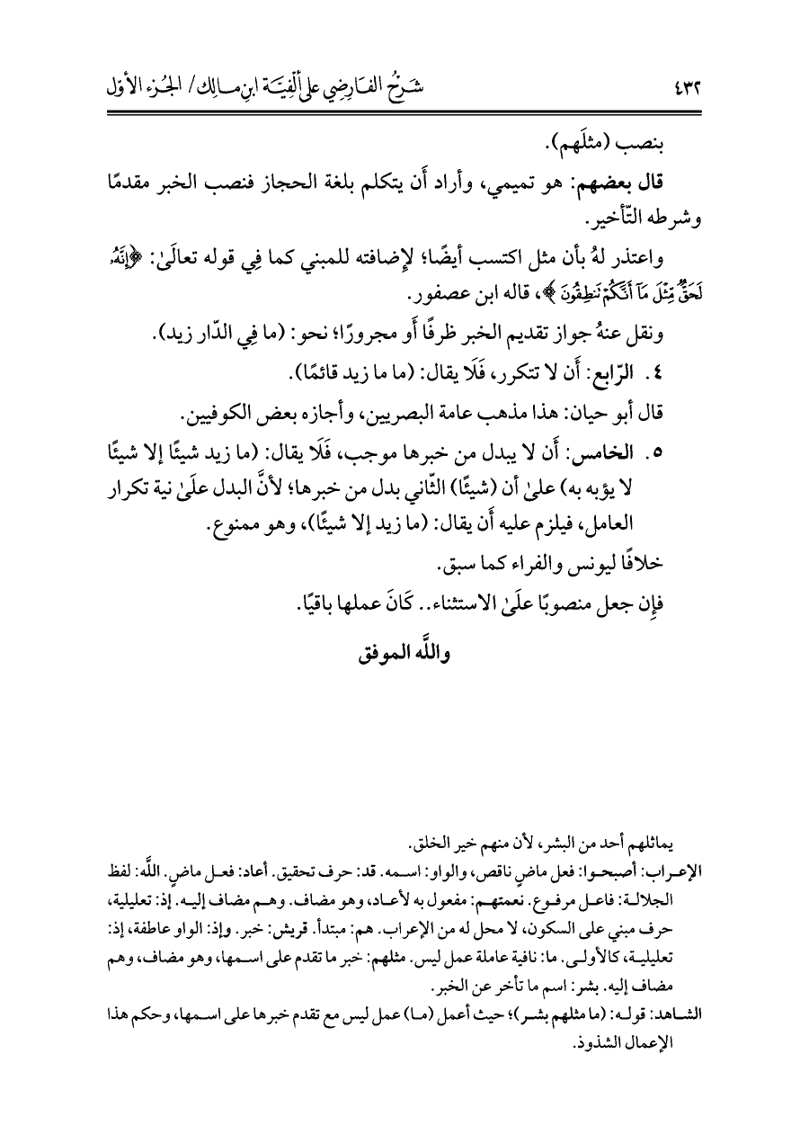 الشاهد: قوله: (ما مثلهم بشر)؛ حيث أعمل (ما) عمل ليس مع تقدم خبرها على اسمها، وحكم هذا الإعمال الشذوذ.