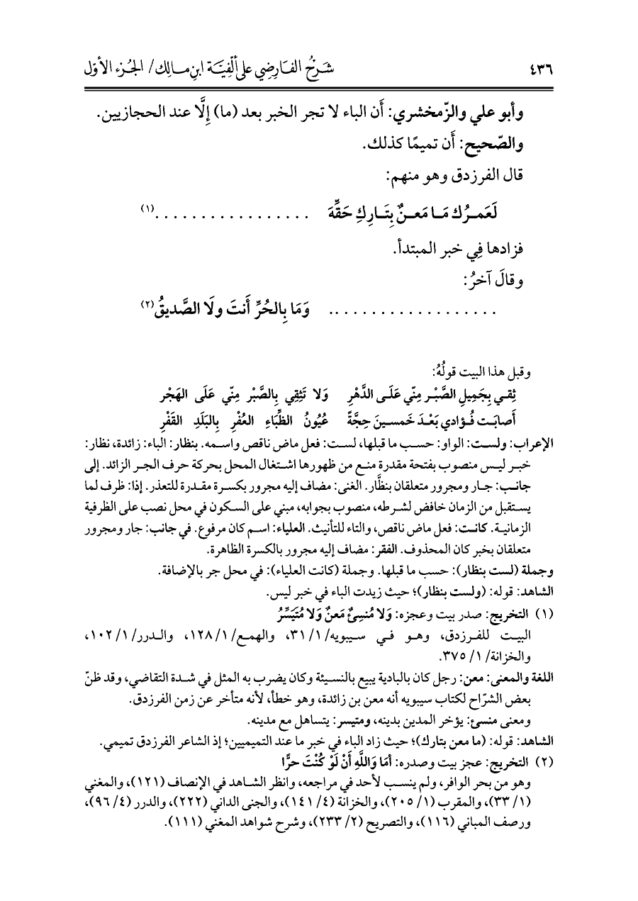 وأبو علي والزّمخشري: أَن الباء لا تجر الخبر بعد (ما) إِلَّا عند الحجازيين.