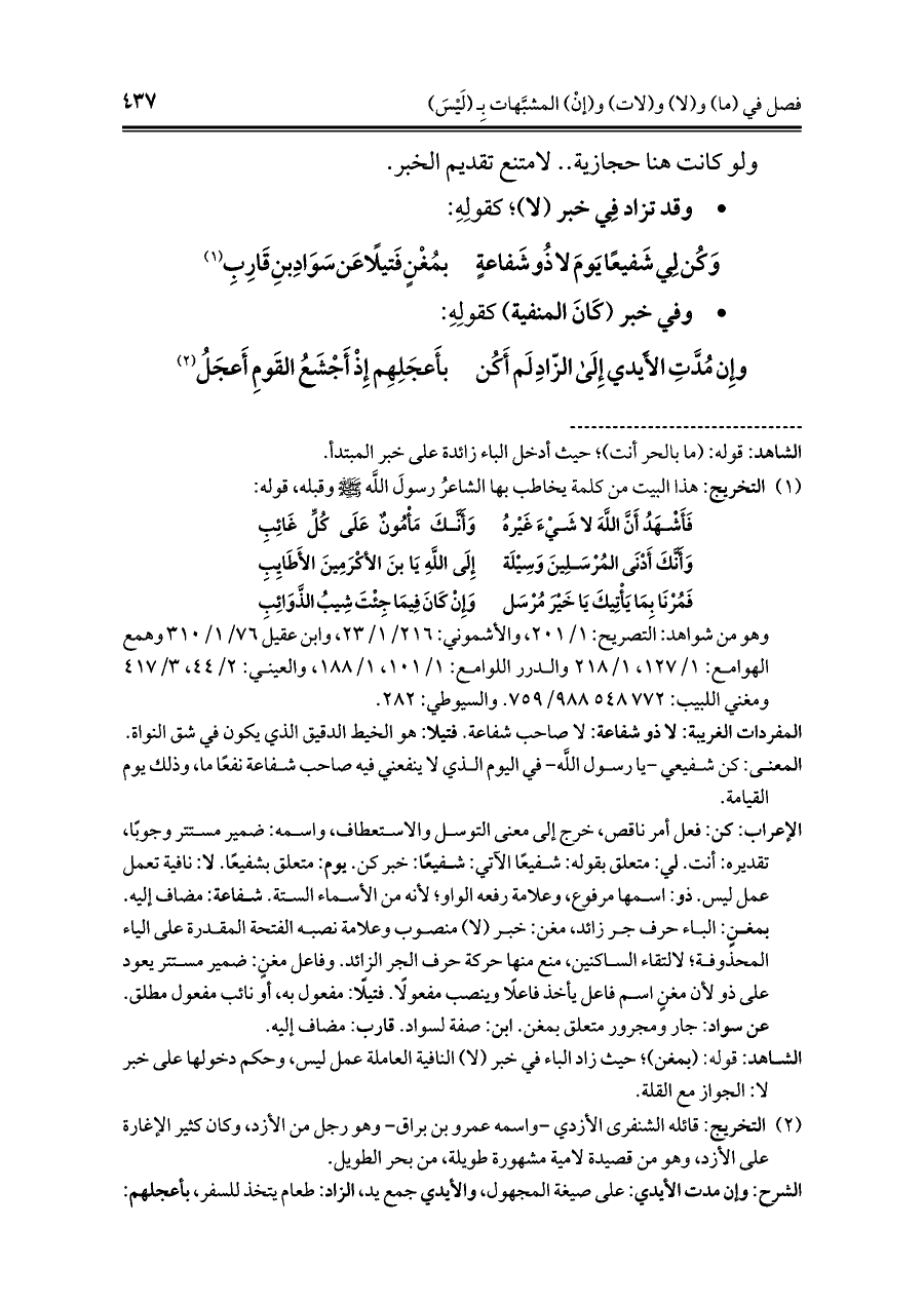 الشاهد: قوله: (بمغن)؛ حيث زاد الباء في خبر (لا) النافية العاملة عمل ليس، وحكم دخولها على خبر لا: الجواز مع القلة.