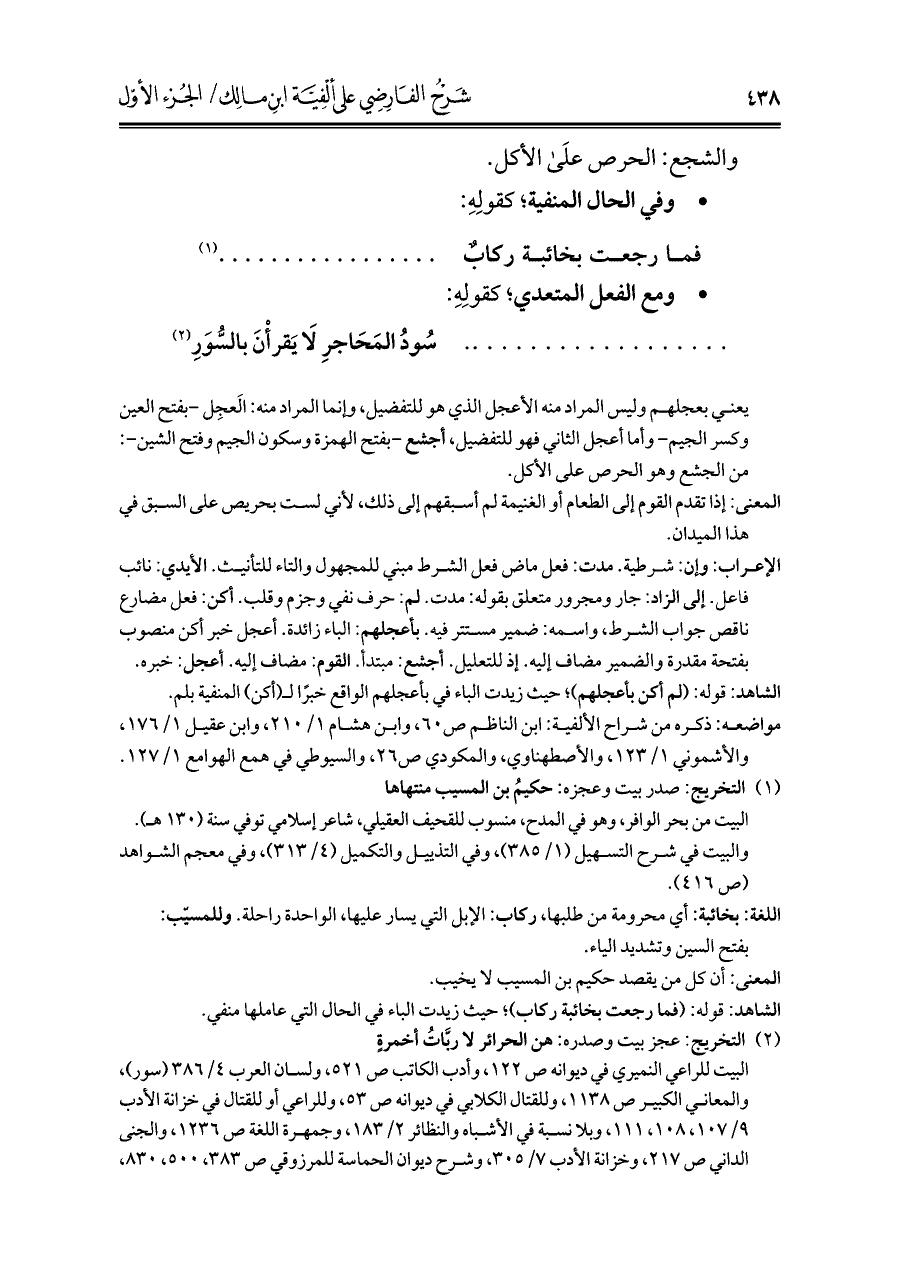 الشاهد: قوله: (فما رجعت بخائبة ركاب)، حيث زيدت الباء في الحال التي عاملها منفي.