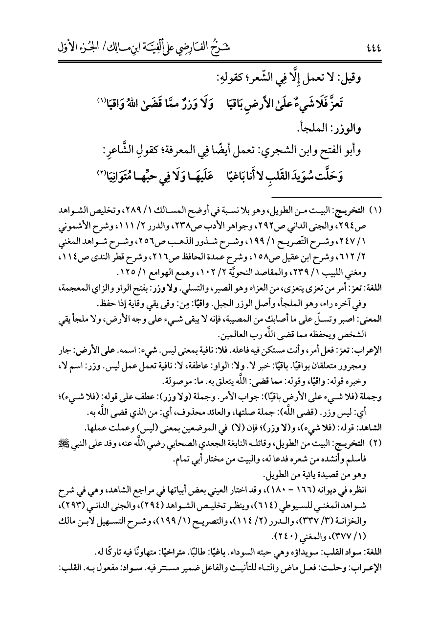 تَعزَّ فَلَا شَيءٌ علَى الأرضِ بَاقيَا ... وَلَا وَزرٌ ممَّا قَضَى اللهُ وَاقيَا (¬١)
