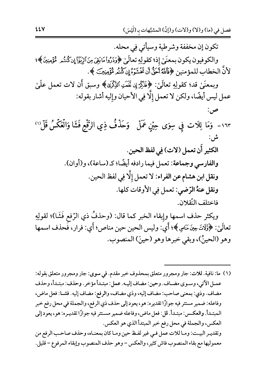 ١٦٣ - وَمَا لِلَات فِي سِوَى حِين عَمَلْ ... وَحَذفُ ذِي الرَّفعِ فَشَا وَالعَكْسُ قَلّ (¬١)