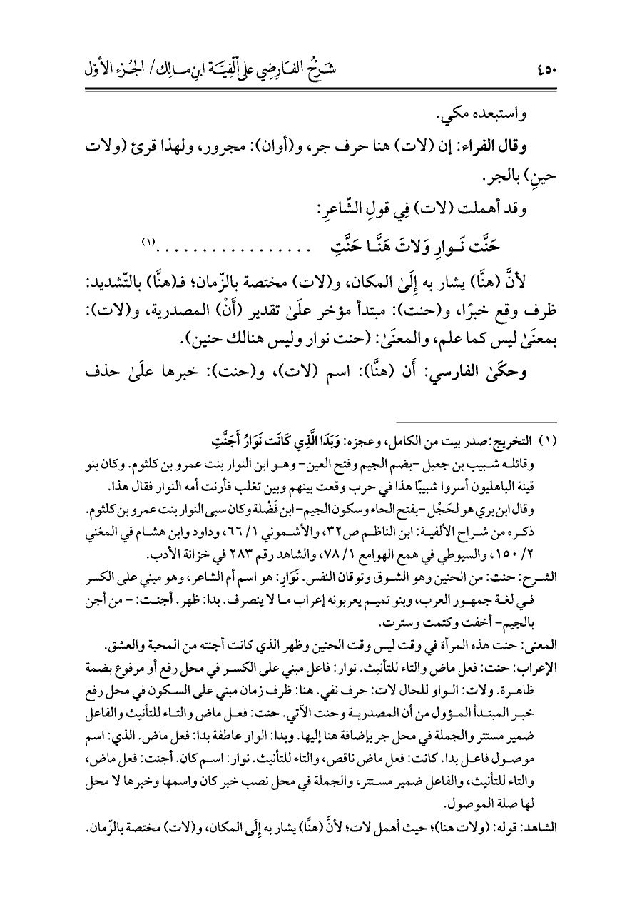 الإعراب: حنت: فعل ماض والتاء للتأنيث. نوار: فاعل مبني على الكسر في محل رفع أو مرفوع بضمة ظاهرة. ولات: الواو للحال لات: حرف نفي. هنا: ظرف زمان مبني على السكون في محل رفع خبر المبتدأ المؤول من أن المصدرية وحنت الآتي. حنت: فعل ماض والتاء للتأنيث والفاعل ضمير مستتر والجملة في محل جر بإضافة هنا إليها. وبدا: الواو عاطفة بدا: فعل ماض. الذي: اسم موصول فاعل بدا. كانت: فعل ماض ناقص، والتاء للتأنيث. نوار: اسم كان. أجنت: فعل ماض، والتاء للتأنيث، والفاعل ضمير مستتر، والجملة في محل نصب خبر كان واسمها وخبرها لا محل لها صلة الموصول.