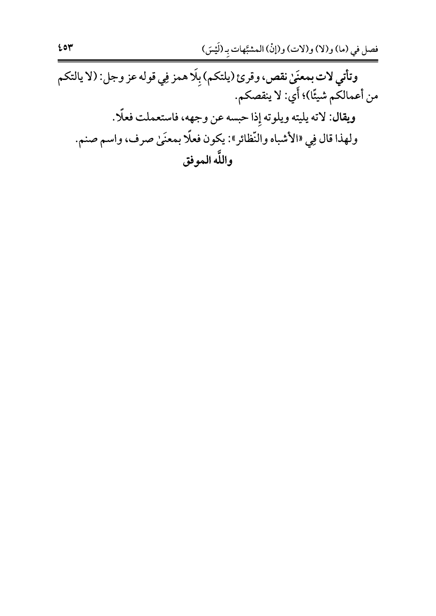 وتأتي لات بمعنَى نقص، وقرئ (يلتكم) بِلَا همز فِي قوله عز وجل: (لا يالتكم من أعمالكم شيئًا)؛ أَي: لا ينقصكم.