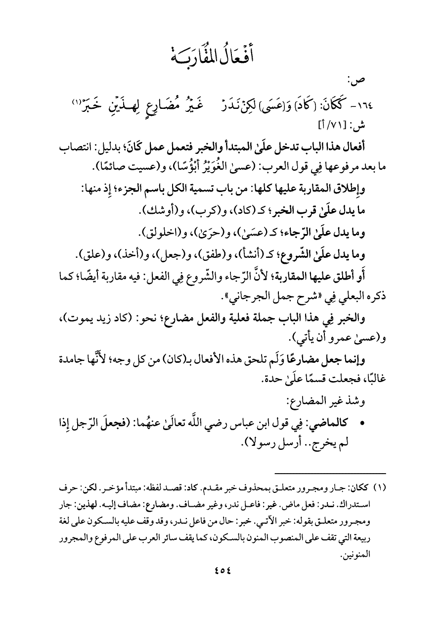 ١٦٤ - كَكَانَ: (كَادَ) وَ (عَسَى) لكِنْ نَدَرْ ... غَيْرُ مُضَارِعٍ لِهذَيْنِ خَبَرْ (¬١)