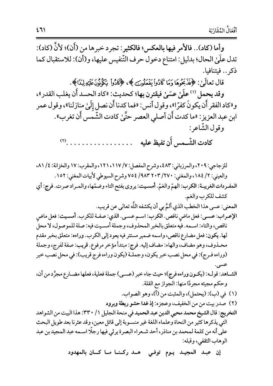 وقد يحمل (¬١) علَى عسَى فيقترن بها؛ كحديث: "كاد الحسد أَن يغلب القدر"، و"كاد الفقر أَن يكونَ كفرًا"، وقول أنس: "فما كدنا أَن نصل إِلَى منازلنا"، وقول عمر ابن عبد العزيز: "ما كدت أَن أصلي العصر حتَّى كادت الشّمس أَن تغرب".