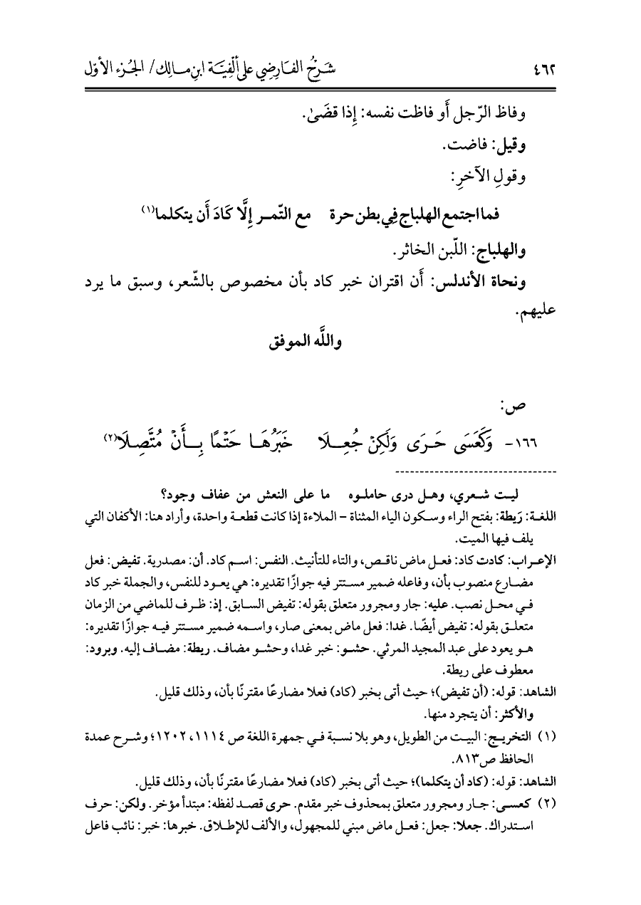 الشاهد: قوله: (كاد أن يتكلما)؛ حيث أتى بخبر (كاد) فعلا مضارعًا مقترنًا بأن، وذلك قليل.