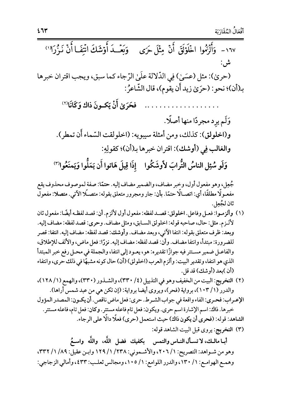 ١٦٧ - وَأَلْزَمُوا اخْلَوْلَقَ أَنْ مِثْلَ حَرَى ... وَبَعْدَ أَوْشَكَ انْتِفَا أَنْ نَزُرَا (¬١)