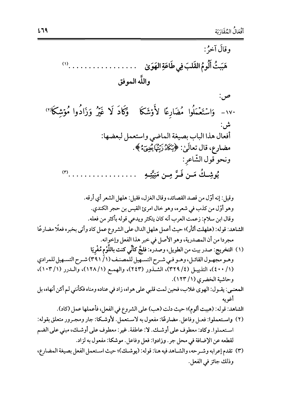 (¬٣) تقدم إعرابه وشرحه، والشاهد فيه هنا: قوله: (يوشك)؛ حيث استعمل الفعل بصيغة المضارع، وذلك جائز في الفعل.