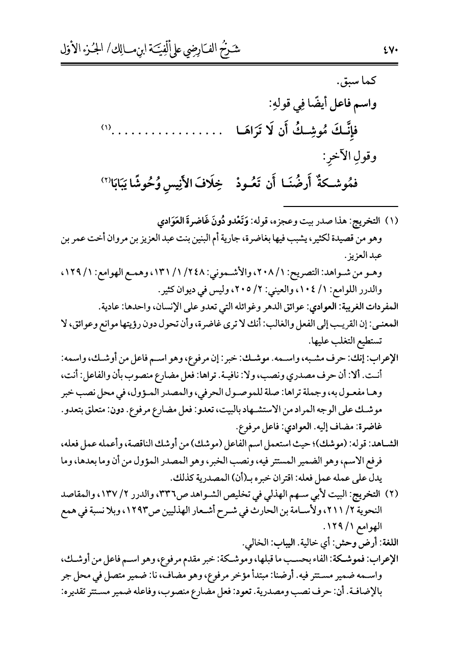 الشاهد: قوله: (موشك)؛ حيث استعمل اسم الفاعل (موشك) من أوشك الناقصة، وأعمله عمل فعله، فرفع الاسم، وهو الضمير المستتر فيه، ونصب الخبر، وهو المصدر المؤول من أن وما بعدها، وما يدل على عمله عمل فعله: اقتران خبره بـ (أن) المصدرية كذلك.