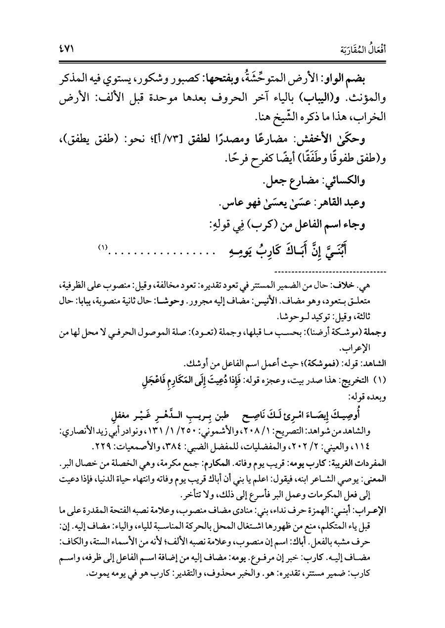 الإعراب: أبني: الهمزة حرف نداء، بني: منادى مضاف منصوب، وعلامة نصبه الفتحة المقدرة على ما قبل ياء المتكلم، منع من ظهورها اشتغال المحل بالحركة المناسبة للياء، والياء: مضاف إليه. إن: حرف مشبه بالفعل. أباك: اسم إن منصوب، وعلامة نصبه الألف؛ لأنه من الأسماء الستة، والكاف: مضاف إليه. كارب: خبر إن مرفوع. يومه: مضاف إليه من إضافة اسم الفاعل إلى ظرفه، واسم كارب: ضمير مستتر، تقديره: هو. والخبر محذوف، والتقدير: كارب هو في يومه يموت.
