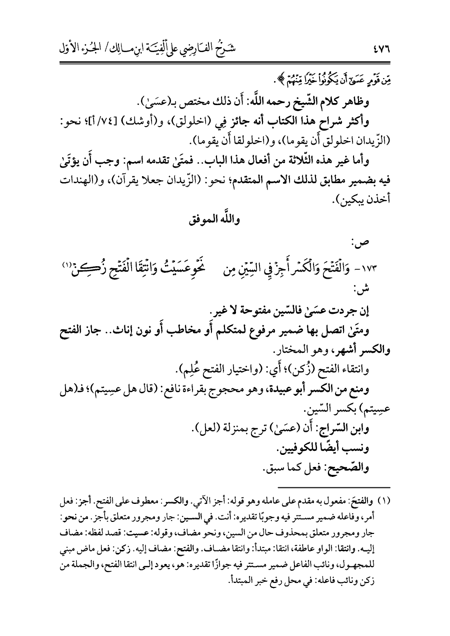 ١٧٣ - وَالْفَتْحَ وَالْكَسْر أَجِزْ فِي السِّيْنِ مِن ... نَحْوِ عَسَيْتُ وَانْتِقَا الْفَتْحِ زُكِنْ (¬١)