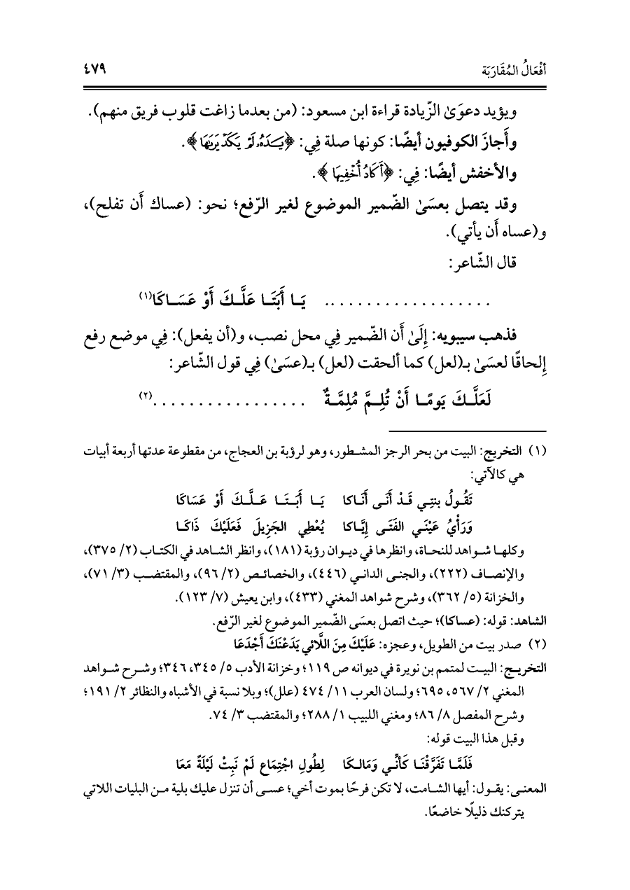 فذهب سيبويه: إِلَى أَن الضّمير فِي محل نصب، و (أن يفعل): فِي موضع رفع إِلحاقًا لعسَى بـ (لعل) كما ألحقت (لعل) بـ (عسَى) فِي قول الشّاعر:
