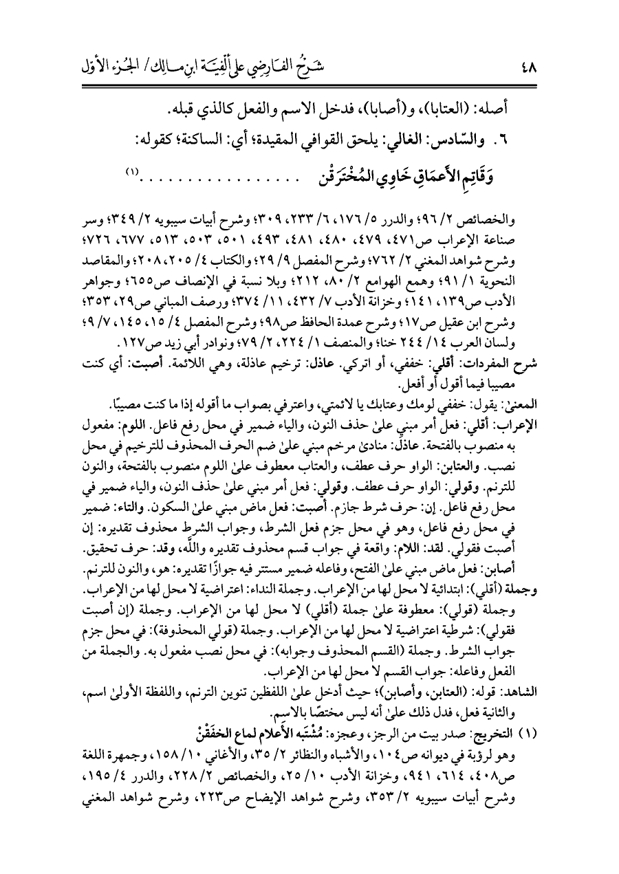 الإعراب: أقلي: فعل أمر مبني على حذف النون، والياء ضمير في محل رفع فاعل. اللوم: مفعول به منصوب بالفتحة. -عاذل: منادى مرخم مبني على ضم الحرف المحذوف للترخيم في محل نصب. والعتابن: الواو حرف عطف، والعتاب معطوف على اللوم منصوب بالفتحة، والنون للترنم. وقولي: الواو حرف عطف. قولي: فعل أمر مبني على حذف النون، والياء ضمير في محل رفع فاعل. إن: حرف شرط جازم. أصبت: فعل ماض مبني على السكون. والتاء: ضمير في محل رفع فاعل، وهو في محل جزم فعل الشرط، وجواب الشرط محذوف تقديره: إن أصبت فقولي. لقد: اللام: واقعة في جواب قسم محذوف تقديره واللَّه، وقد: حرف تحقيق. أصابن: فعل ماض مبني على الفتح، وفاعله ضمير مستتر فيه جوازًا تقديره: هو، والنون للترنم.