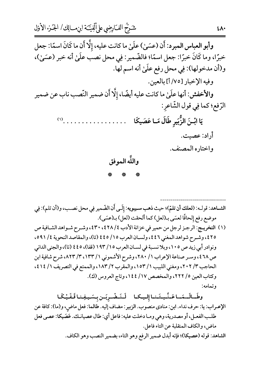 الشاهد: قوله: (لعلك أن تلمّ)؛ حيث ذهب سيبويه: إِلَى أَن الضّمير فِي محل نصب، و (أن تلم): فِي موضع رفع إِلحاقًا لعسَى بـ (لعل) كما ألحقت (لعل) بـ (عسَى).
