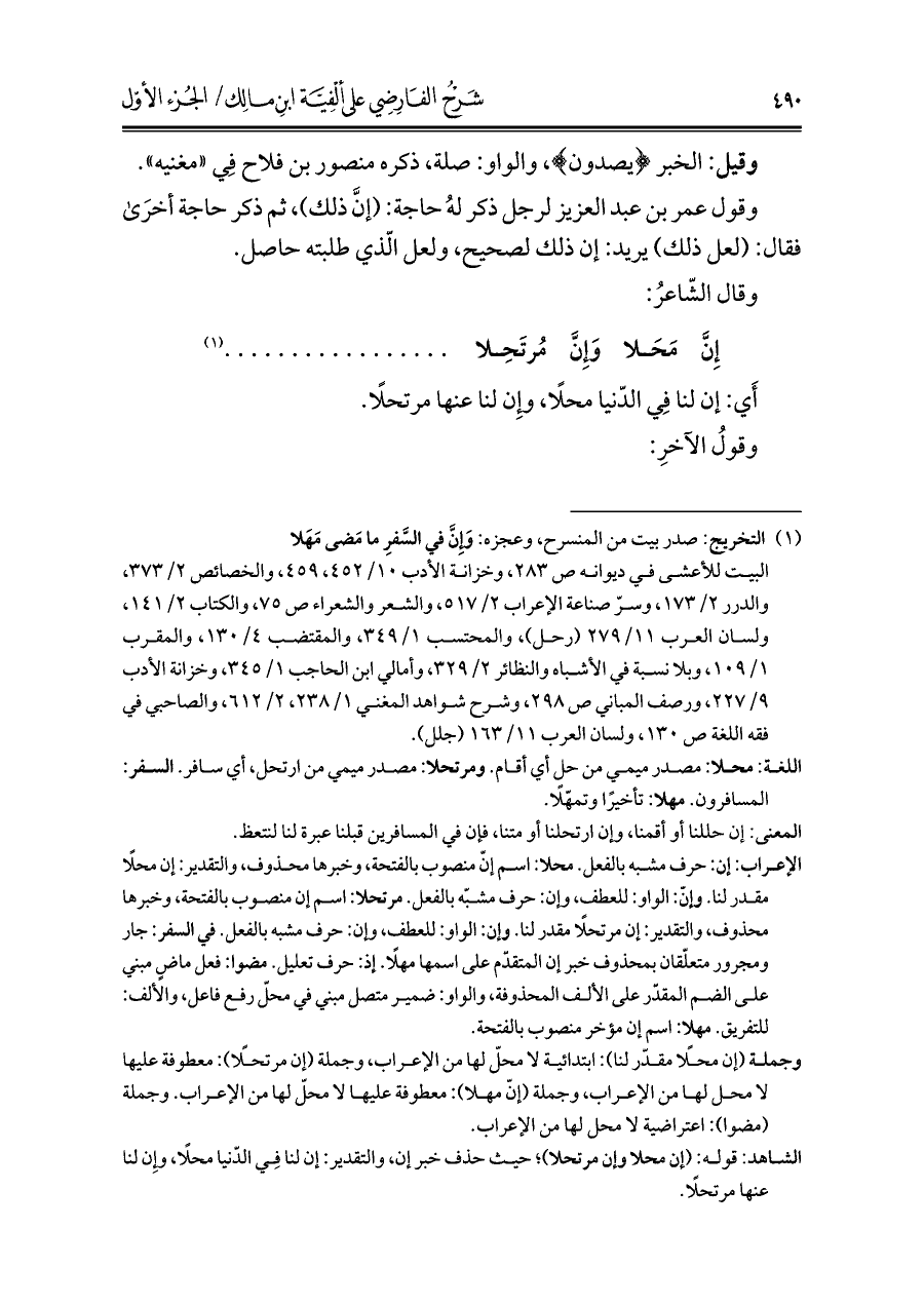 الشاهد: قوله: (إن محلا وإن مرتحلا)؛ حيث حذف خبر إن، والتقدير: إن لنا فِي الدّنيا محلًا، وإِن لنا عنها مرتحلًا.