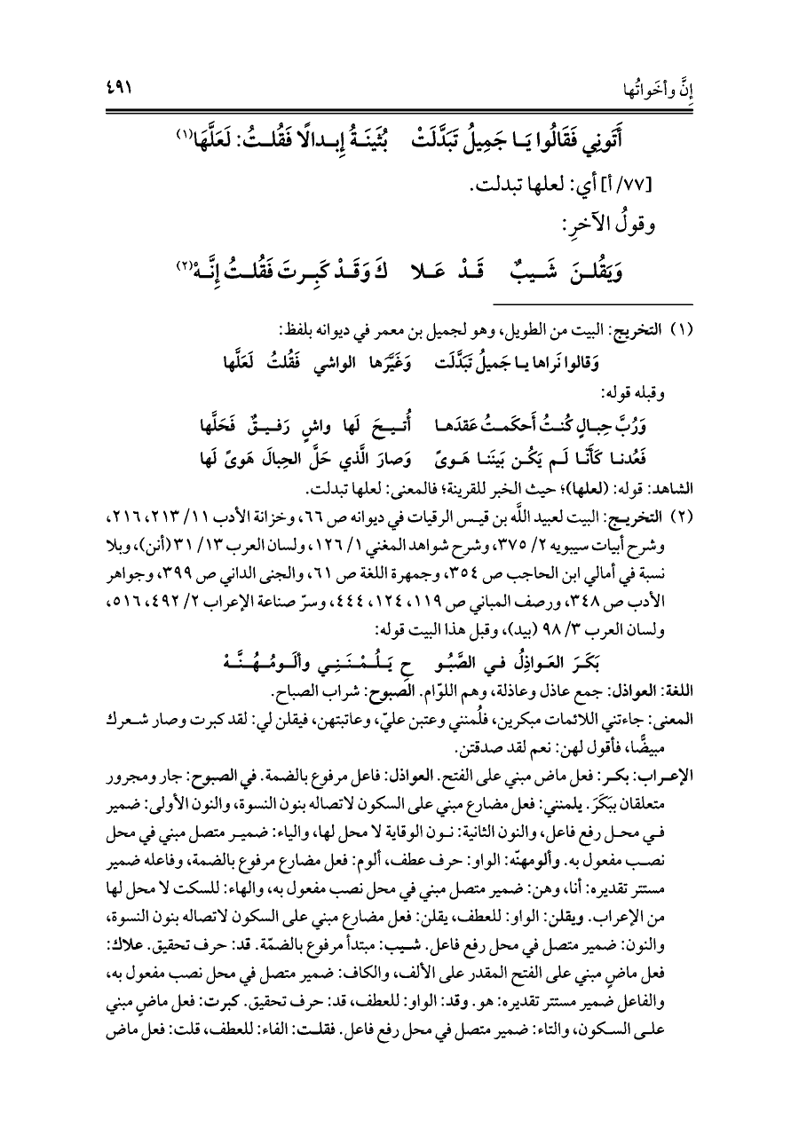 أَتَونِي فَقَالُوا يَا جَمِيلُ تَبَدَّلَتْ ... بُثَينَةُ إِبدالًا فَقُلتُ: لَعَلَّهَا (¬١)