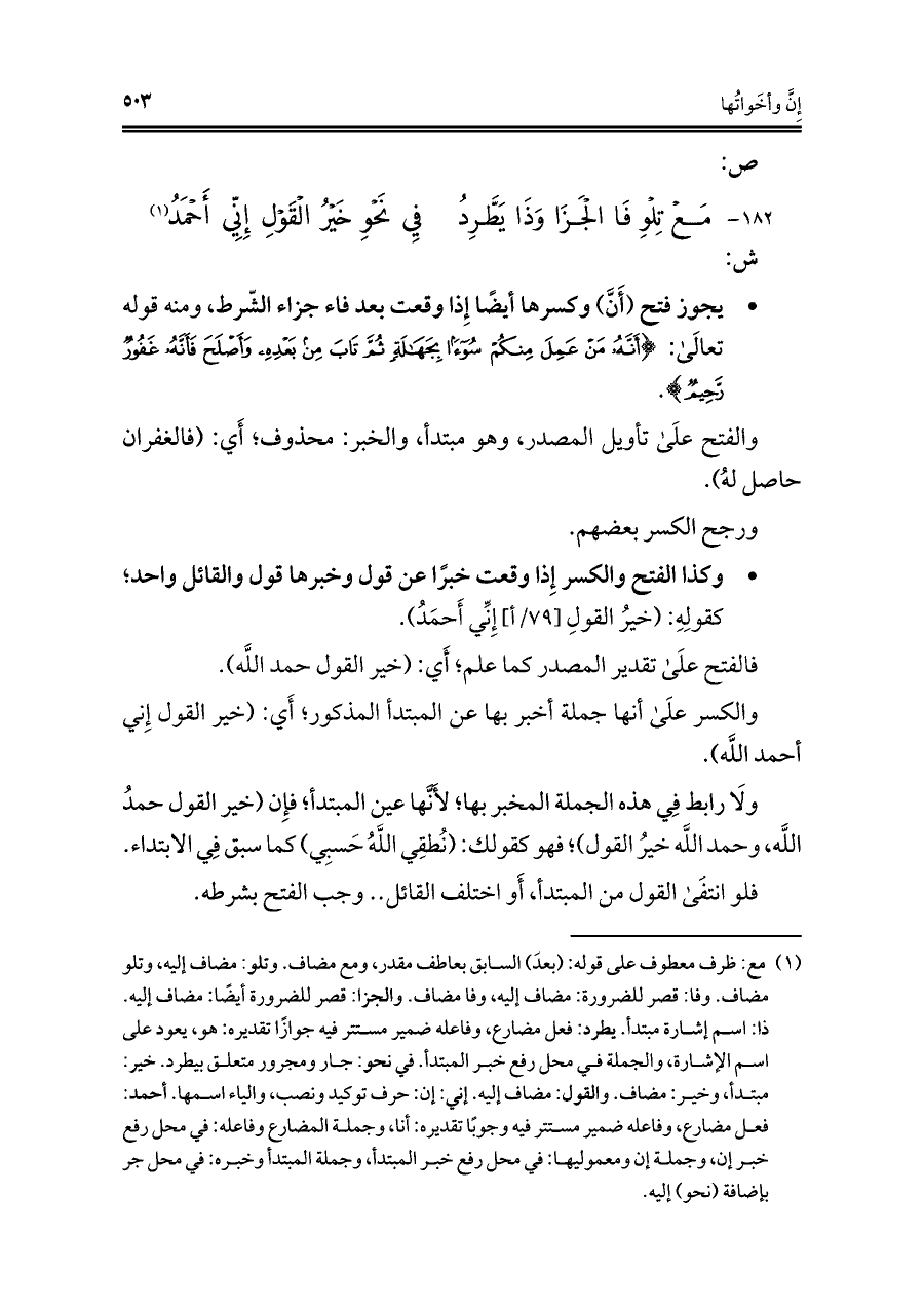 (¬١) مع: ظرف معطوف على قوله: (بعدَ) السابق بعاطف مقدر، ومع مضاف. وتلو: مضاف إليه، وتلو مضاف. وفا: قصر للضرورة: مضاف إليه، وفا مضاف. والجزا: قصر للضرورة أيضًا: مضاف إليه. ذا: اسم إشارة مبتدأ. يطرد: فعل مضارع، وفاعله ضمير مستتر فيه جوازًا تقديره: هو، يعود على اسم الإشارة، والجملة في محل رفع خبر المبتدأ. في نحو: جار ومجرور متعلق بيطرد. خير: مبتدأ، وخير: مضاف. والقول: مضاف إليه. إني: إن: حرف توكيد ونصب، والياء اسمها. أحمد: فعل مضارع، وفاعله ضمير مستتر فيه وجوبًا تقديره: أنا، وجملة المضارع وفاعله: في محل رفع خبر إن، وجملة إن ومعموليها: في محل رفع خبر المبتدأ، وجملة المبتدأ وخبره: في محل جر بإضافة (نحو) إليه.