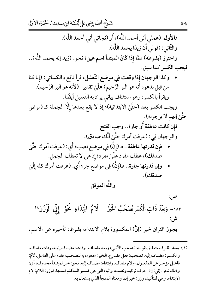 (¬١) بعد: ظرف متعلق بقوله: تصحب الآتي، وبعد مضاف. وذات: مضاف إليه، وذات مضاف. والكسر: مضاف إليه. تصحب: فعل مضارع. الخبر: مفعول به لتصحب مقدم على الفاعل. لامُ: فاعل مؤخر عن المفعول، ولام مضاف. وابتداء: مضاف إليه. نحو: خبر لمبتدأ محذوف، أي: وذلك نحو. إني: إن: حرف توكيد ونصب، والياء التي هي ضمير المتكلم اسمها. لوزر: اللام: لام الابتداء، وهي للتأكيد، وزر: خبر إن، ومعناه الملجأ الذي يستعان به.