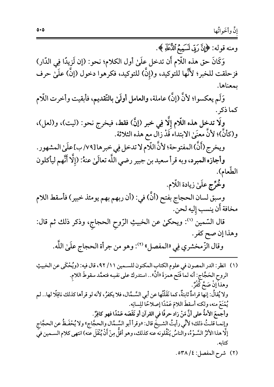 (¬١) انظر: الدر المصون في علوم الكتاب المكنون للسمين ١١/ ٩٢، قال فيه: (ويُحْكَى عن الخبيثِ الروحِ الحَجَّاج: أنه لما فَتَح همزةَ "أنَّ" .. استدرك على نفسِه فتعمَّد سقوطَ اللامِ.