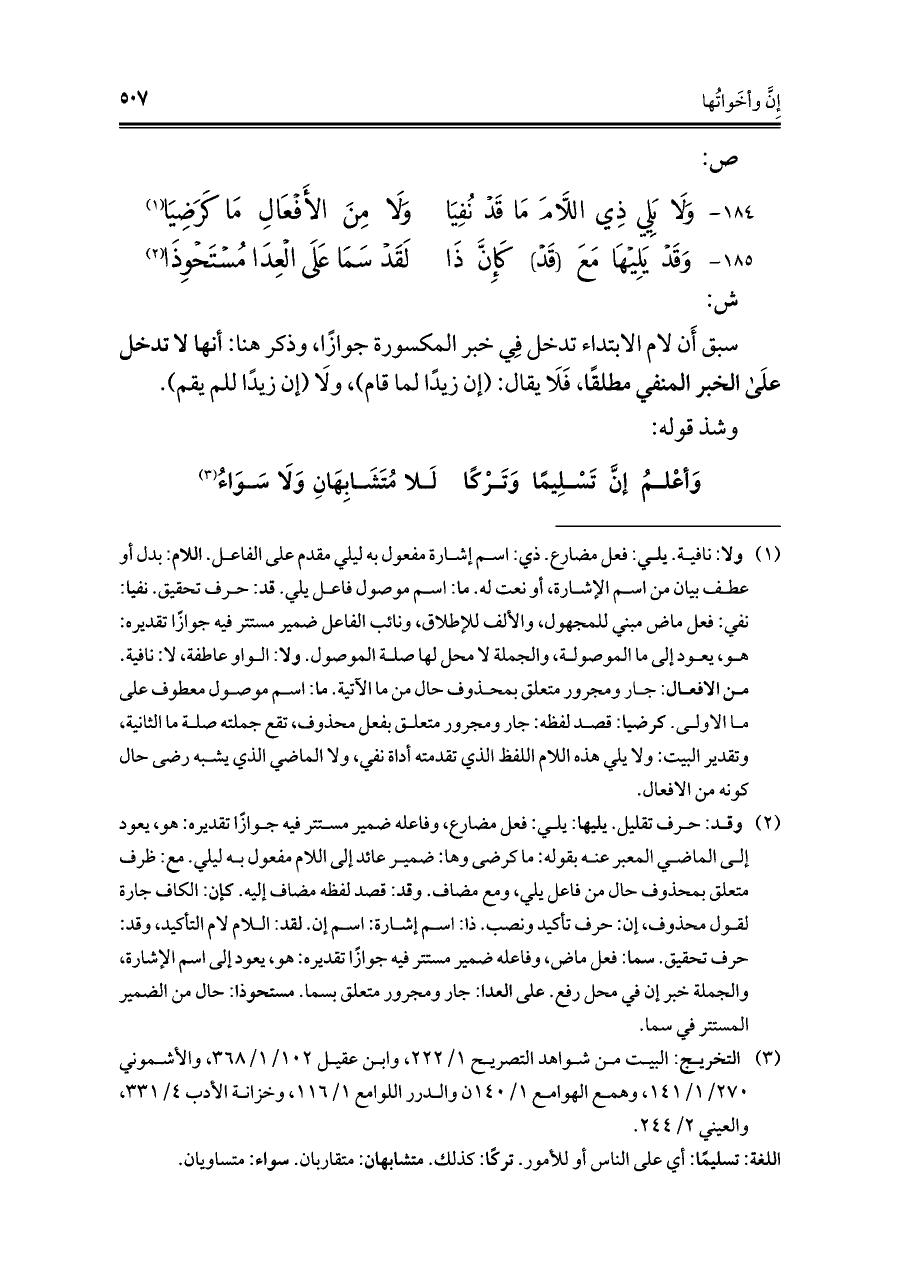 (¬١) ولا: نافية. يلي: فعل مضارع. ذي: اسم إشارة مفعول به ليلي مقدم على الفاعل. اللام: بدل أو عطف بيان من اسم الإشارة، أو نعت له. ما: اسم موصول فاعل يلي. قد: حرف تحقيق. نفيا: نفي: فعل ماض مبني للمجهول، والألف للإطلاق، ونائب الفاعل ضمير مستتر فيه جوازًا تقديره: هو، يعود إلى ما الموصولة، والجملة لا محل لها صلة الموصول. ولا: الواو عاطفة، لا: نافية. من الأفعال: جار ومجرور متعلق بمحذوف حال من ما الآتية. ما: اسم موصول معطوف على ما الأولى. كرضيا: قصد لفظه: جار ومجرور متعلق بفعل محذوف، تقع جملته صلة ما الثانية، وتقدير البيت: ولا يلي هذه اللام اللفظ الذي تقدمته أداة نفي، ولا الماضي الذي يشبه رضى حال كونه من الأفعال.