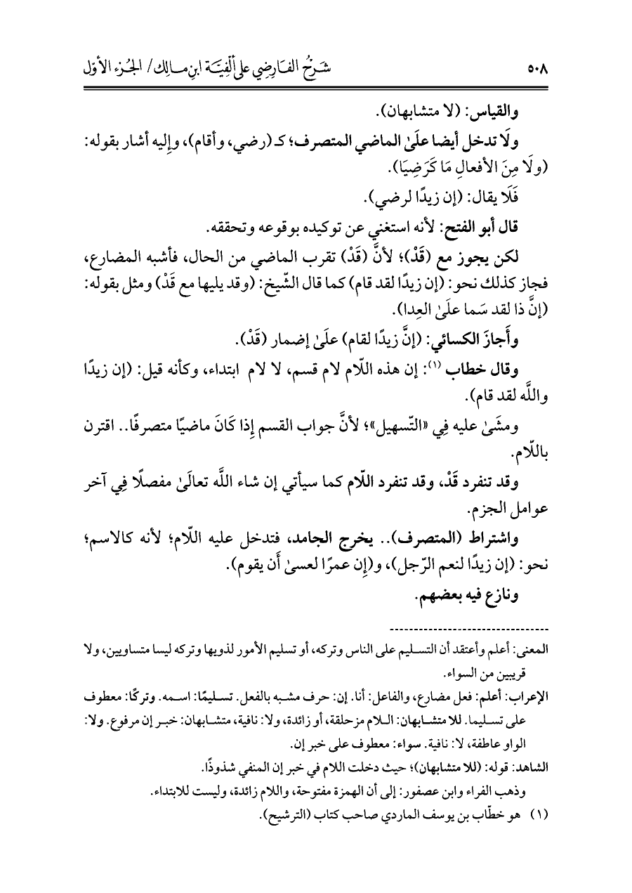 واشتراط (المتصرف) .. يخرج الجامد، فتدخل عليه اللّام؛ لأنه كالاسم؛ نحو: (إن زيدًا لنعم الرّجل)، و (إِن عمرًا لعسى أَن يقوم).
