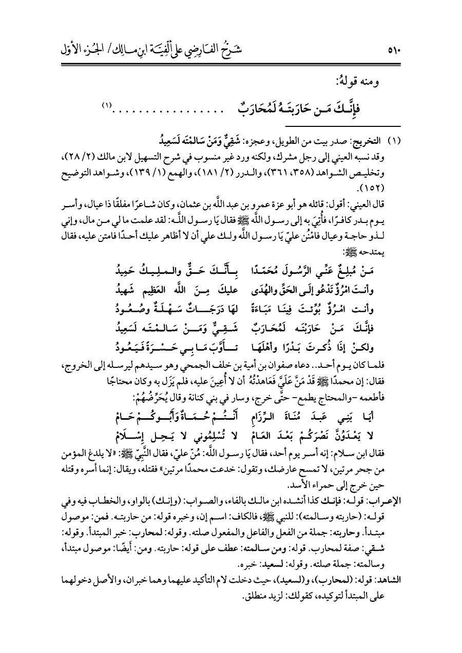 الإعراب: قوله: فإنك كذا أنشده ابن مالك بالفاء، والصواب: (وإنك) بالواو، والخطاب فيه وفي قوله: (حاربته وسالمته): للنبي -صلى الله عليه وسلم-، فالكاف: اسم إن، وخبره قوله: من حاربته. فمن: موصول مبتدأ. وحاربته: جملة من الفعل والفاعل والمفعول صلته. وقوله: لمحارب: خبر المبتدأ. وقوله: شقي: صفة لمحارب. قوله: ومن سالمته: عطف على قوله: حاربته. ومن: أَيضًا: موصول مبتدأ، وسالمته: جملة صلته. وقوله: لسعيد: خبره.